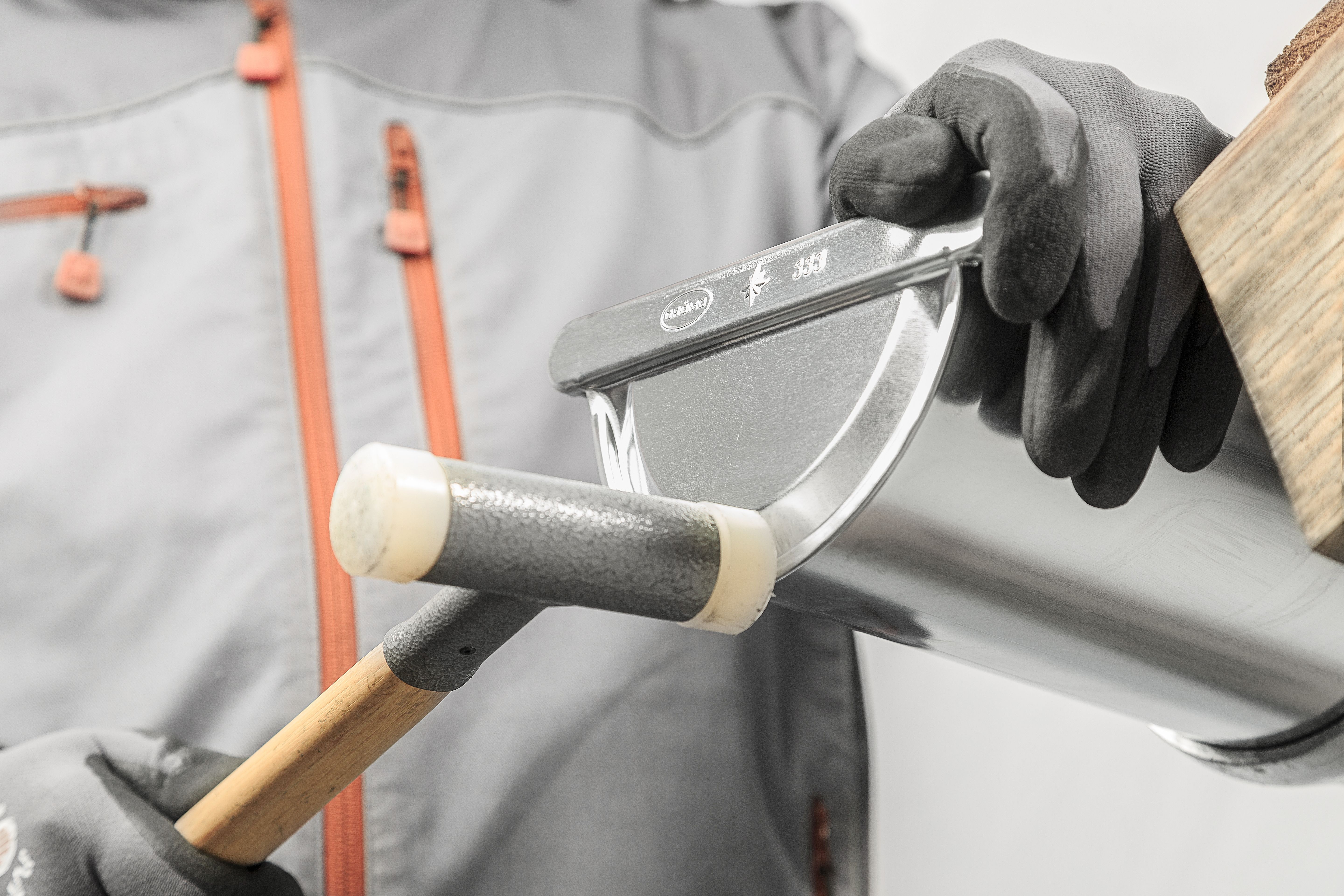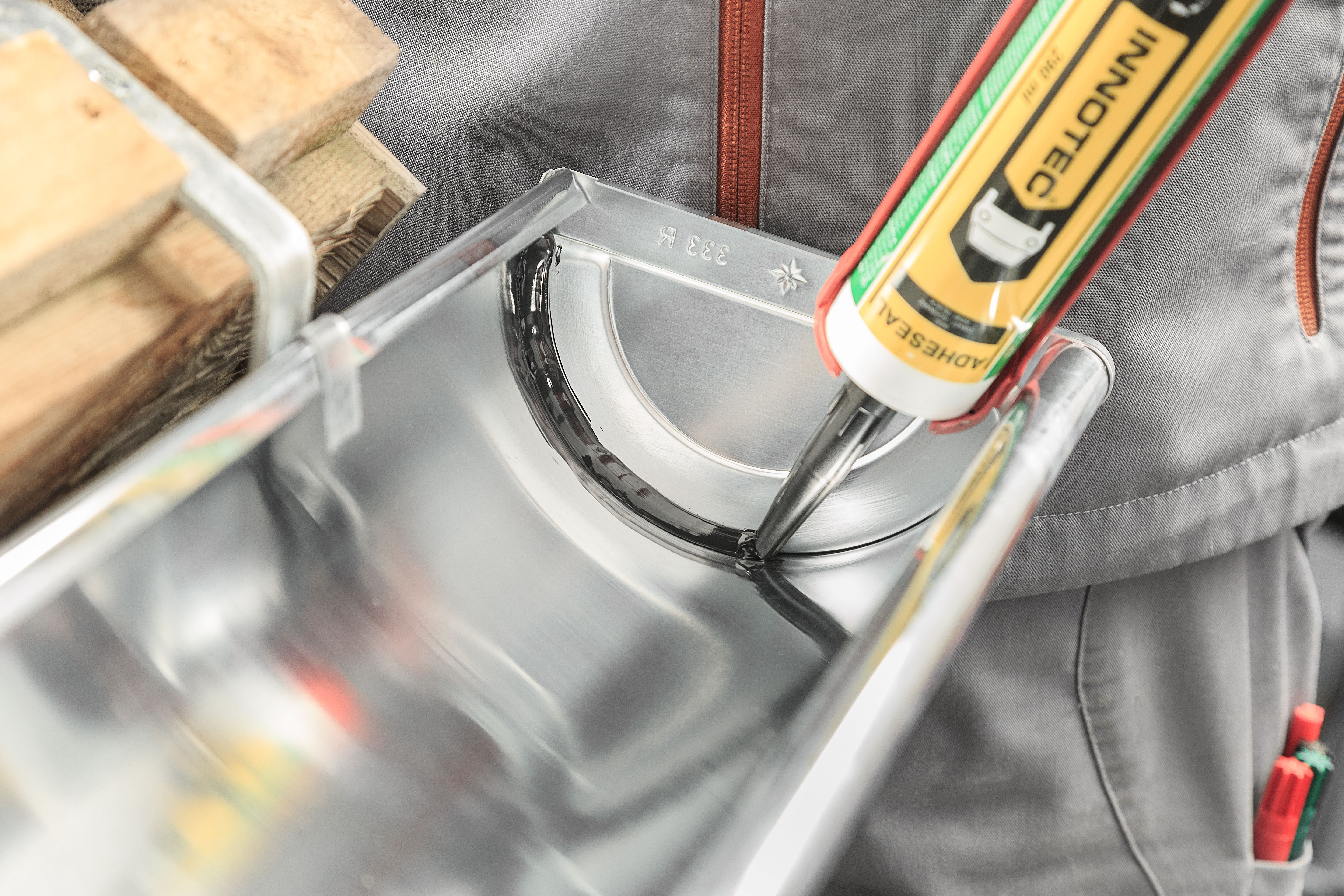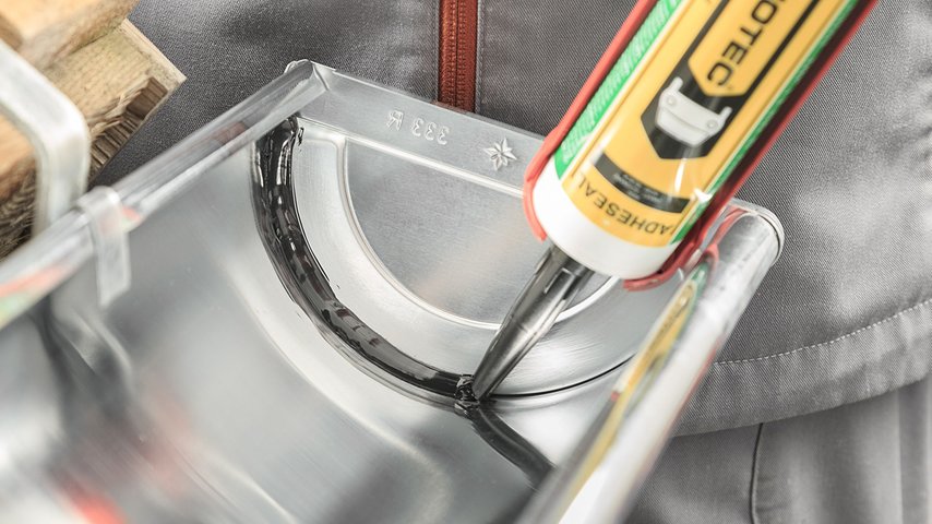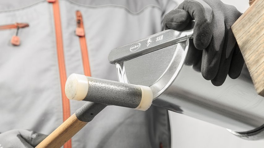 Eine etwas aufwändigere Montage verlangt dagegen der universelle Rinnenboden beim Bördeln. In purer Handwerksleistung wird der Boden nach dem Anreifen des Rinnenendes aufgesetzt und mit einem Hammer gleichmäßig aufgeklopft. Abgedichtet mit Lötzinn oder Kleber, ist er dann fachgerecht mit der Rinne verankert. Der Rinnenboden ist universal für die linke wie rechte Rinnenseite sowie für halbrunde und Kastenrinnen erhältlich und in vielen GRÖMO-Materialausführungen lieferbar.
